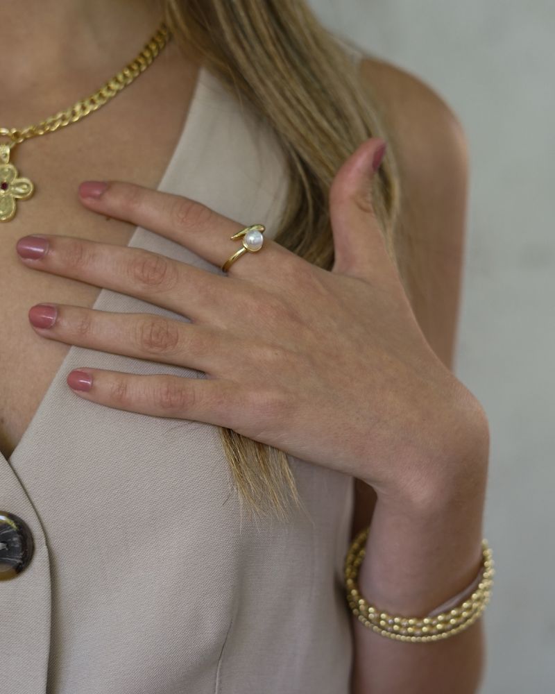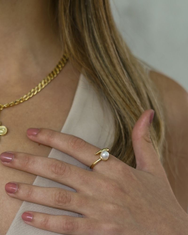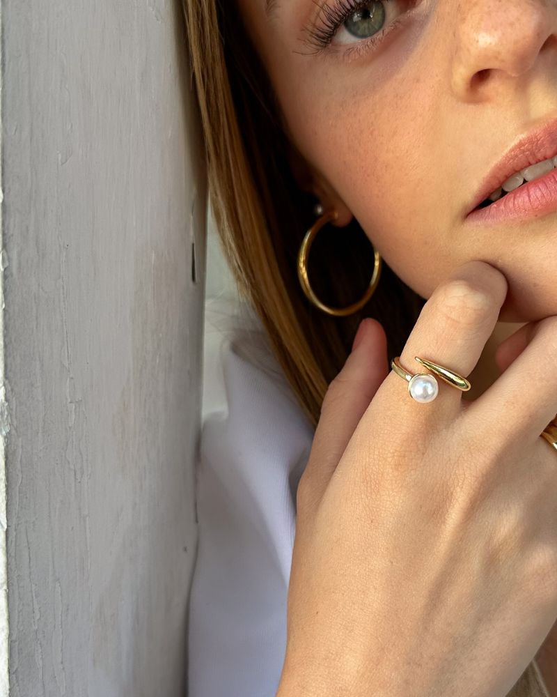 Anillo con unión delantera terminada en una perla, estiloso para uso diario, para darle ese toque a tu outfit, tanto formal como informal.