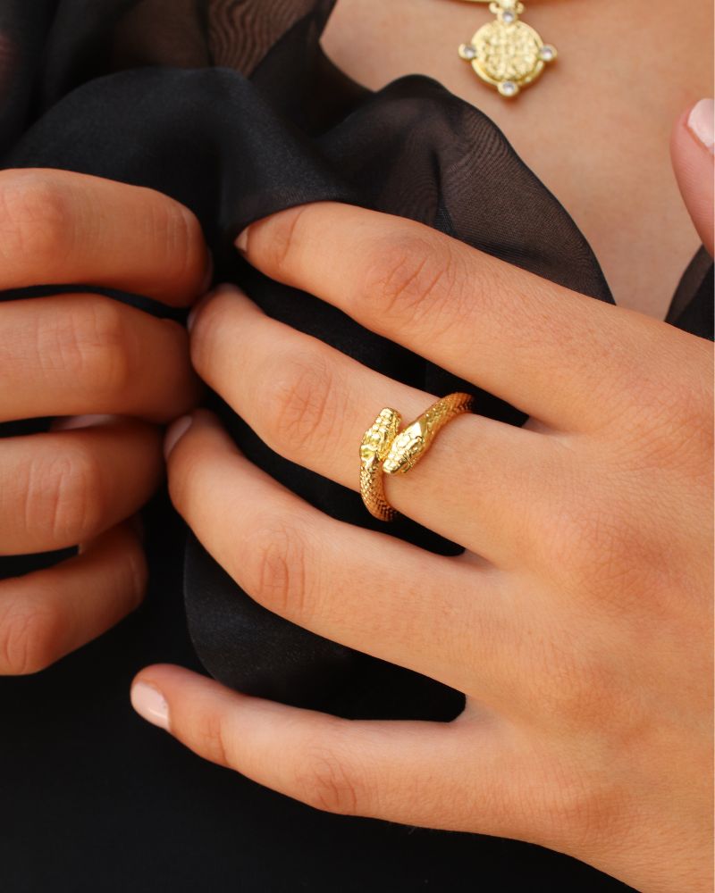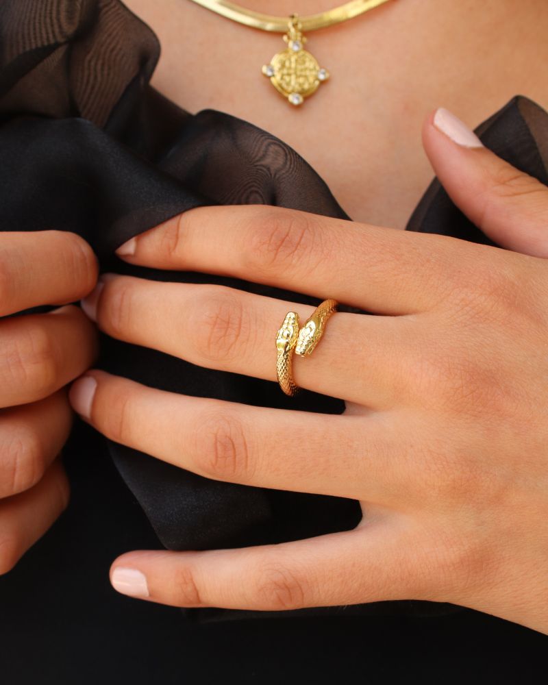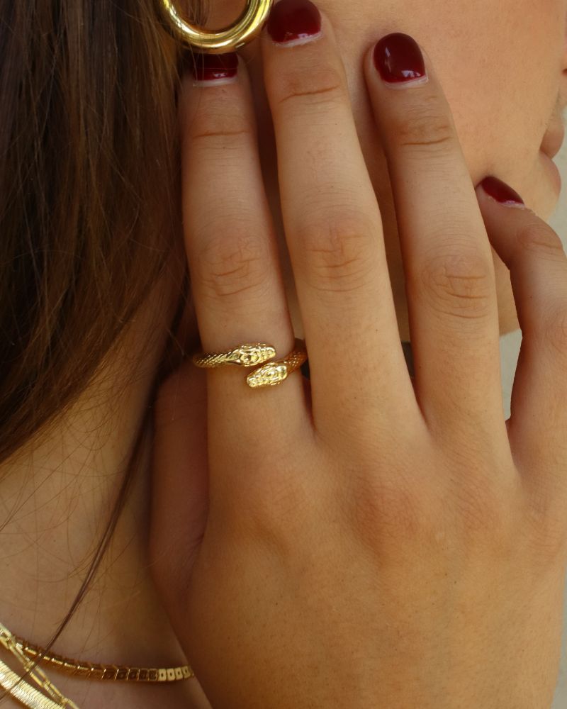 Anillo con unión delantera en forma de dos serpientes lleno de textura, sutil y estiloso para uso diario, para darle ese toque a tu outfit.
