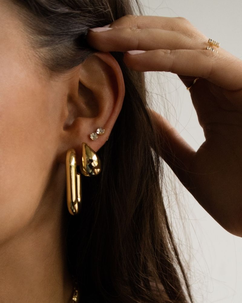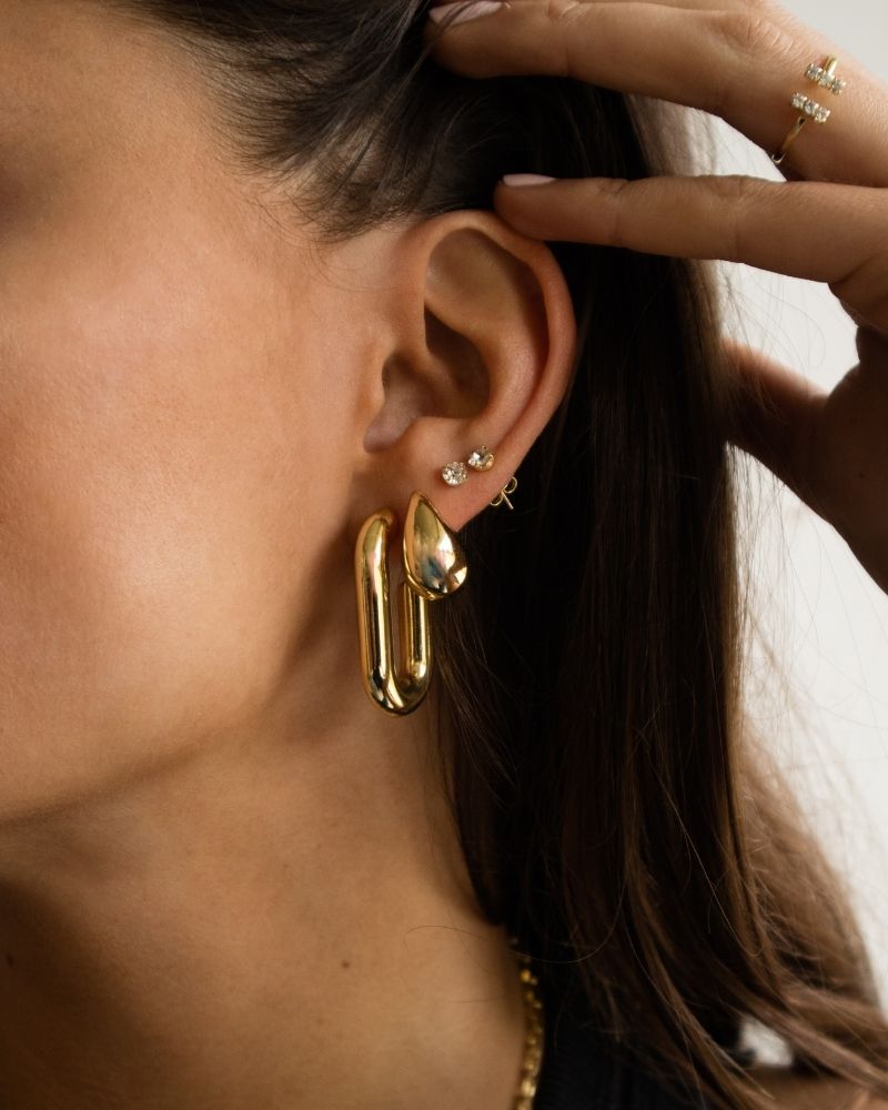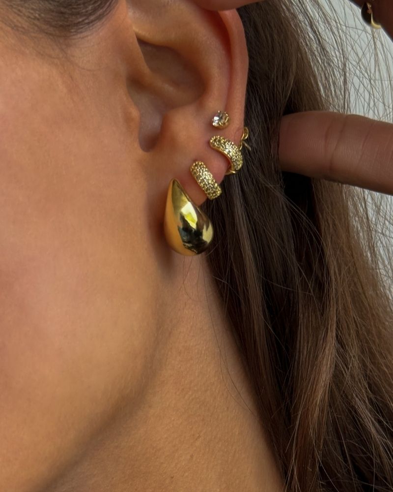 En la foto están puesto el par en la misma oreja en tercera y cuarta perforación, combinados con nuestras Hoop Carrie y Aros Gota Mini.✨