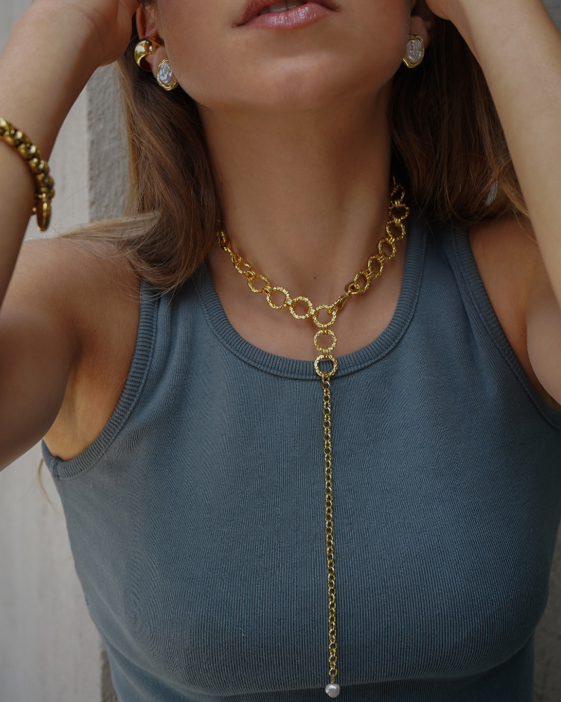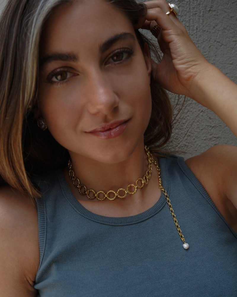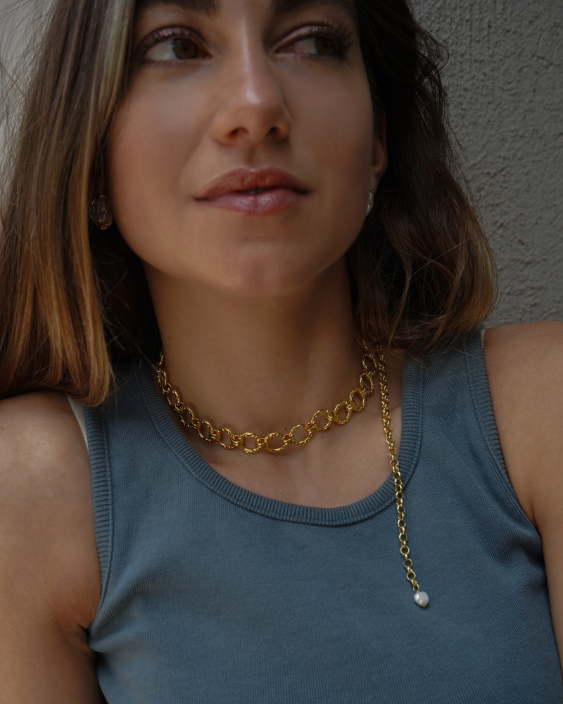 Choker Phoenix muy versátil ideal para darle un toque a un outfit básico, pero también increíble para un look más formal. Puedes usarlo como Choker o como Collar cortito, tiene extensión de cadena y termina en una perlita de río, puedes usarla para atrás o para adelante como cascada, este Collar es ideal para combinar con más collares de distintos largos.