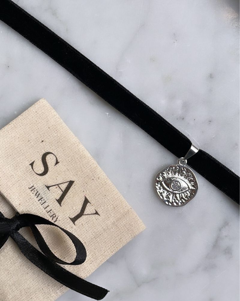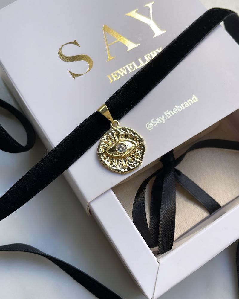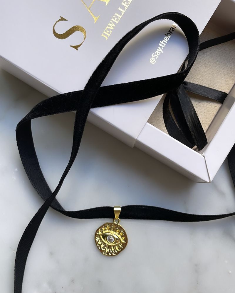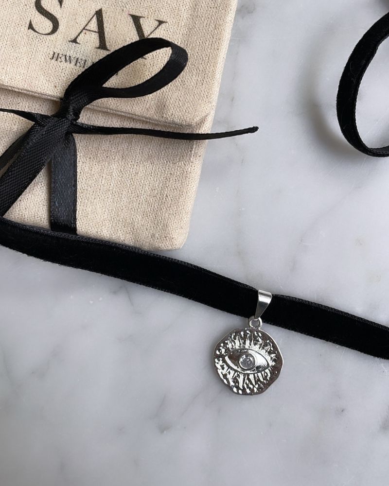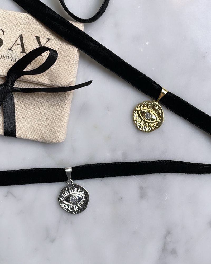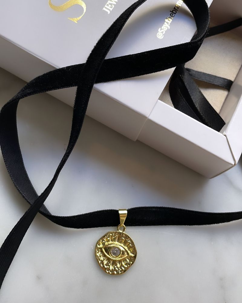 Nuestro nuevo Choker en cinta de terciopelo negra con dije redondo con ojo Turco con detalles en circones, a esta medalla se le atribuye el poder de proteger de la envidia y del mal de ojo, es muy típico de Turquía y Grecia. E s atómico para el día y estiloso para la noche todo depende de tu outfit y con que otros accesorios lo combinen. Una bomba y plena tendencia.