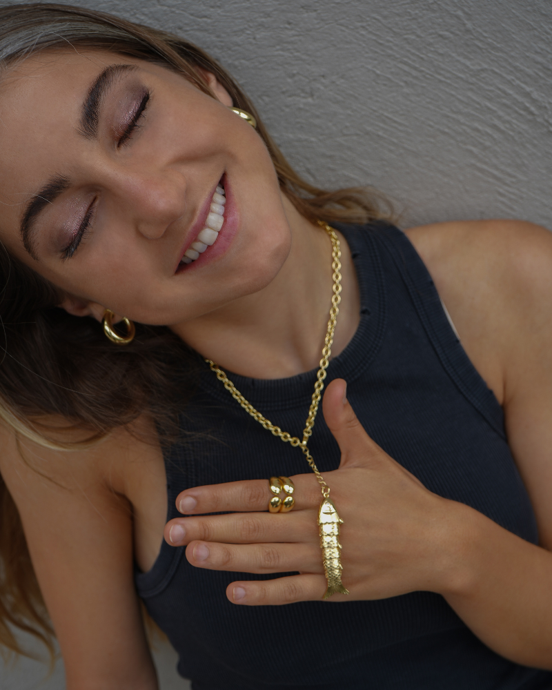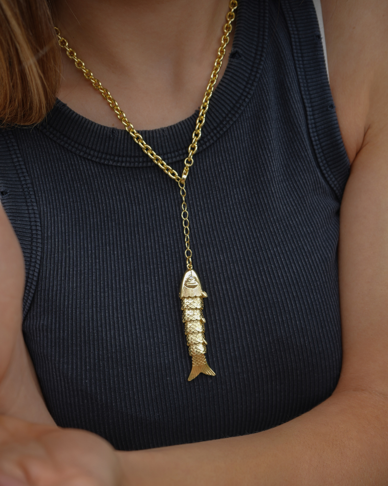 Collar full tendencia para este verano ideal para darle un toque a un outfit básico, Cadena con personalidad que termina en una gran Pez, Puedes ajustar su largo según tu Look, este Collar es ideal para combinar con más collares de distintos largos.