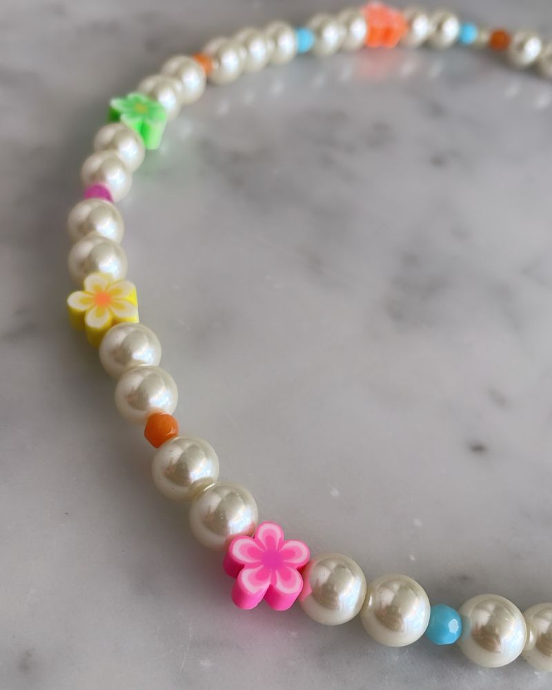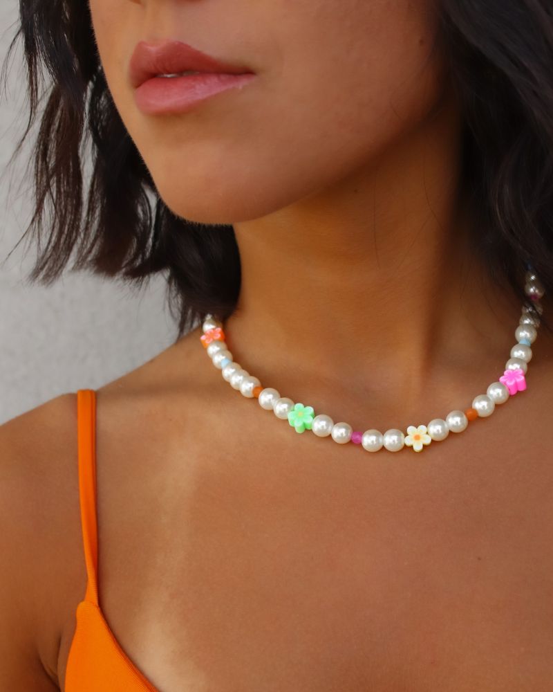 Collar de perlas de vidrio lleno de mostacillas de todos los colores mezclado con flores, increíble para darle ese toque de color a tu outfit, terminado en extensión de cadena y broche baño de oro.