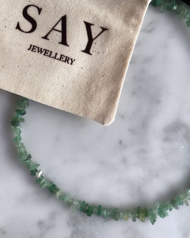 > Piedras en distintos tamaños en tonos verdes con broche y extensión de metal base bronce con enchape de oro 18k, libre de níquel .