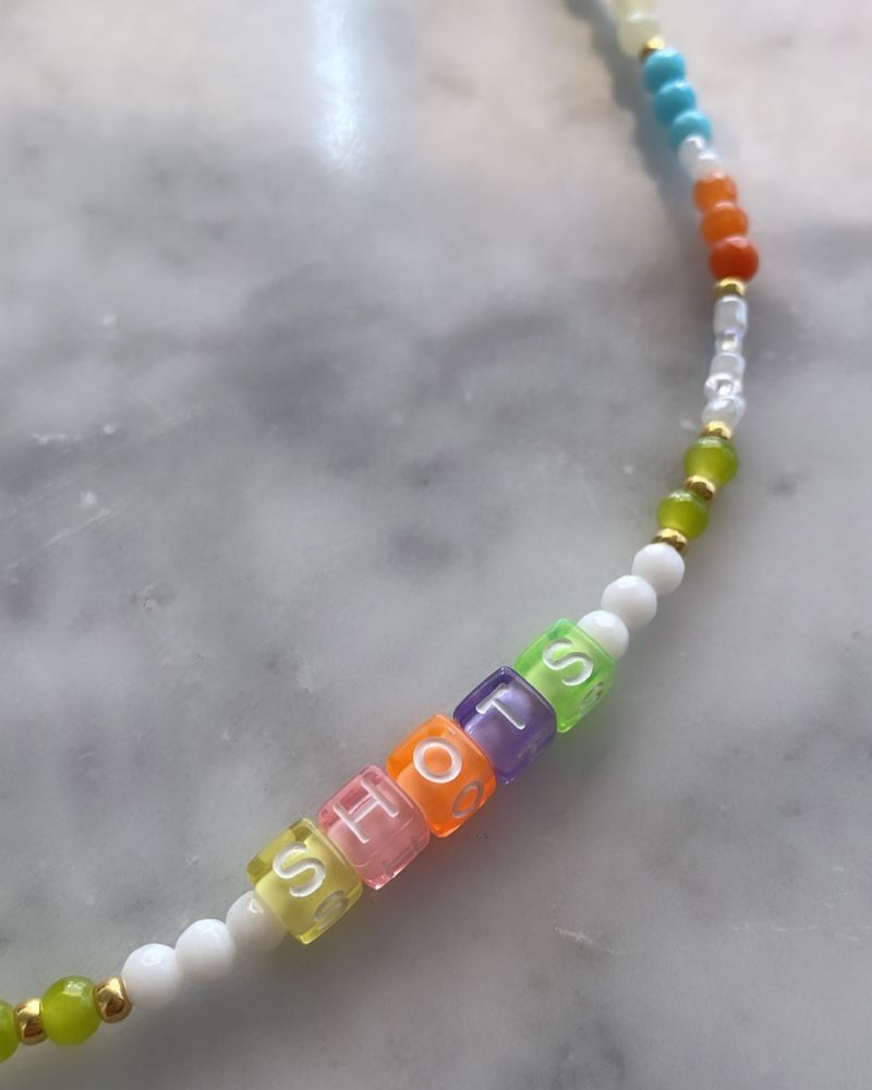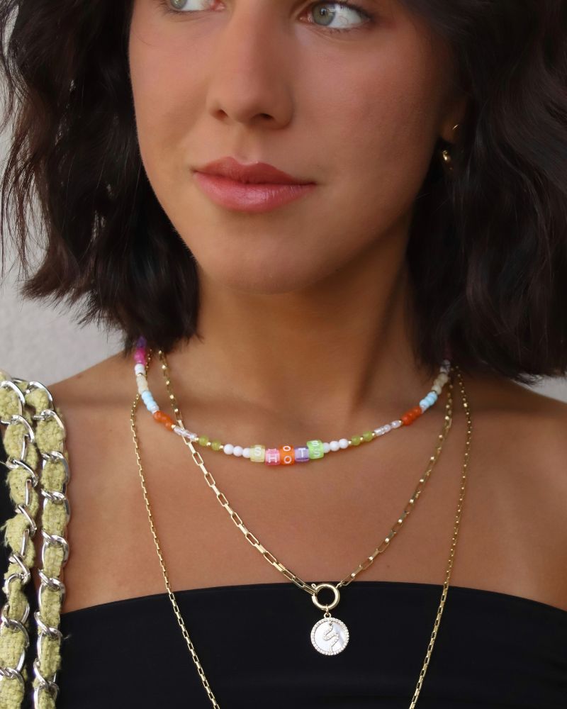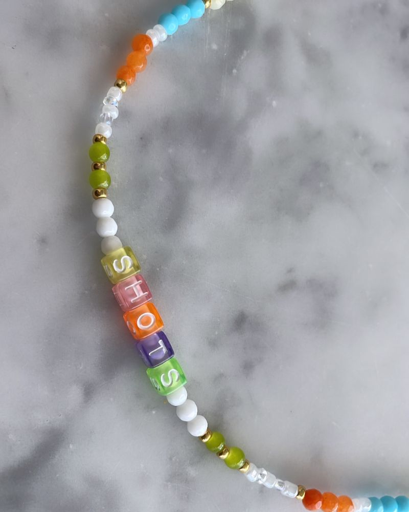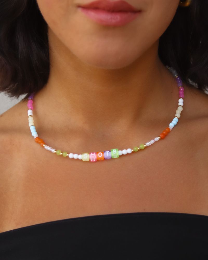 Collar lleno de mostacillas de todos los tamaños y colores mezclado con cristales y piedras entremedio, con palabra "shots" en colores, increíble para darle ese toque de color a tu outfit, terminado en extensión de cadena y broche baño de oro.