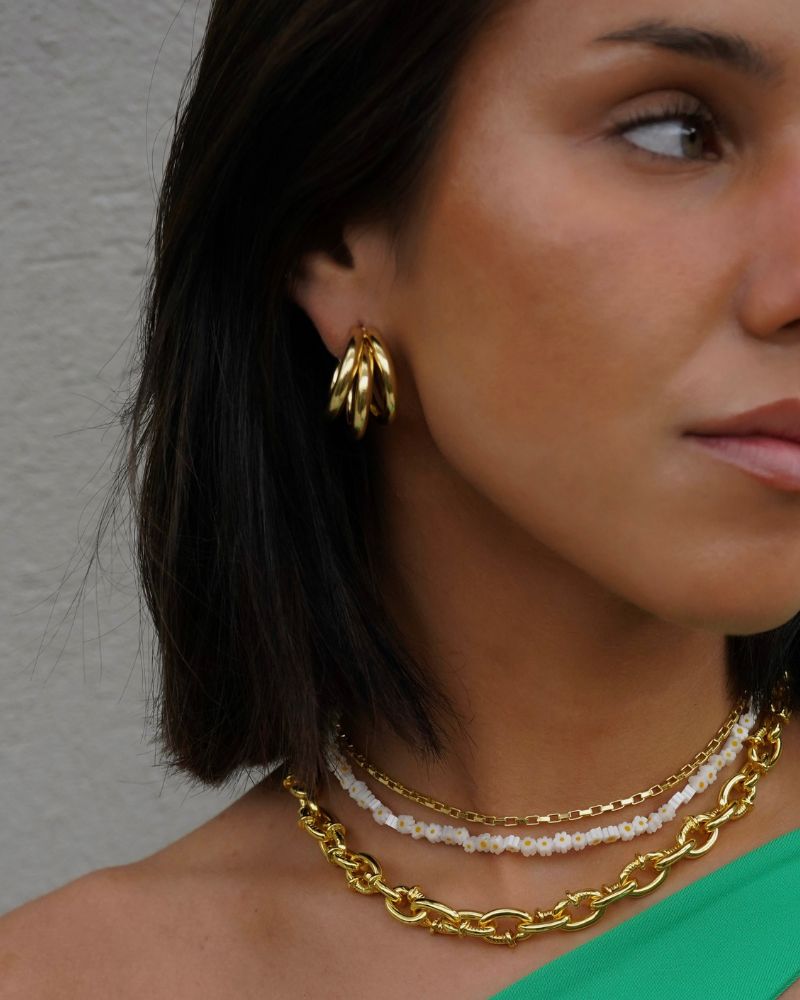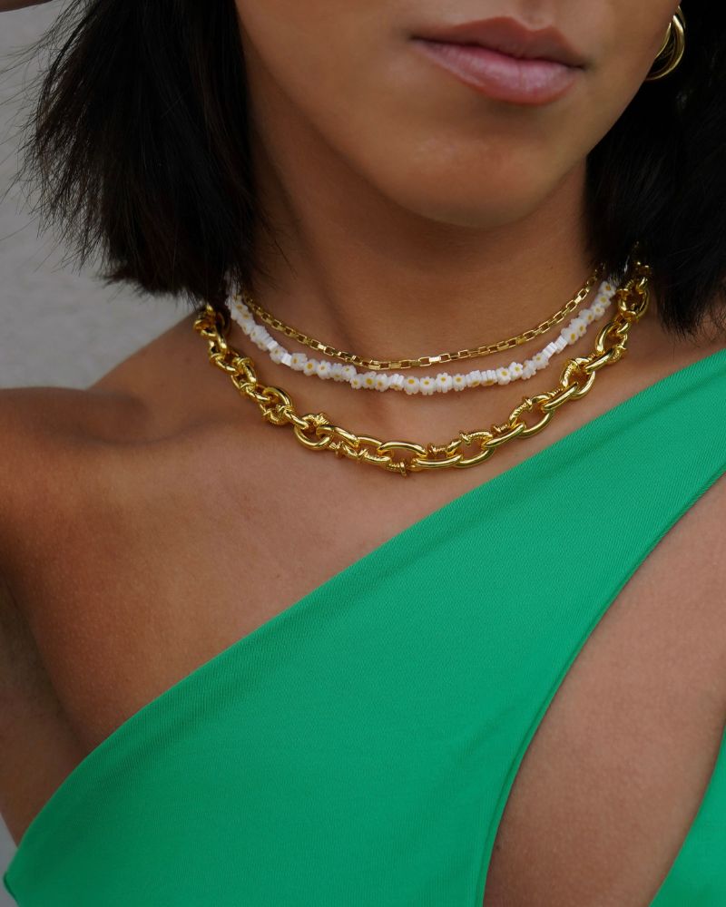 Este Collar promete ser tu amor de verano lleno de mini margaritas de piedra nacar terminado en cadena baño de oro ,para darle ese toque perfecto de dorado para el verano, puedes ajustar su largo, usarlo doble, con una sola vuelta como collar largo o como Body Chain (cadena de cuerpo) en tu cintura.