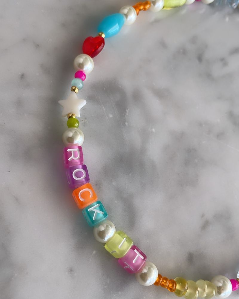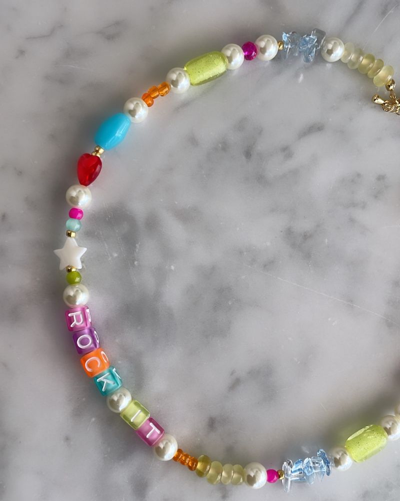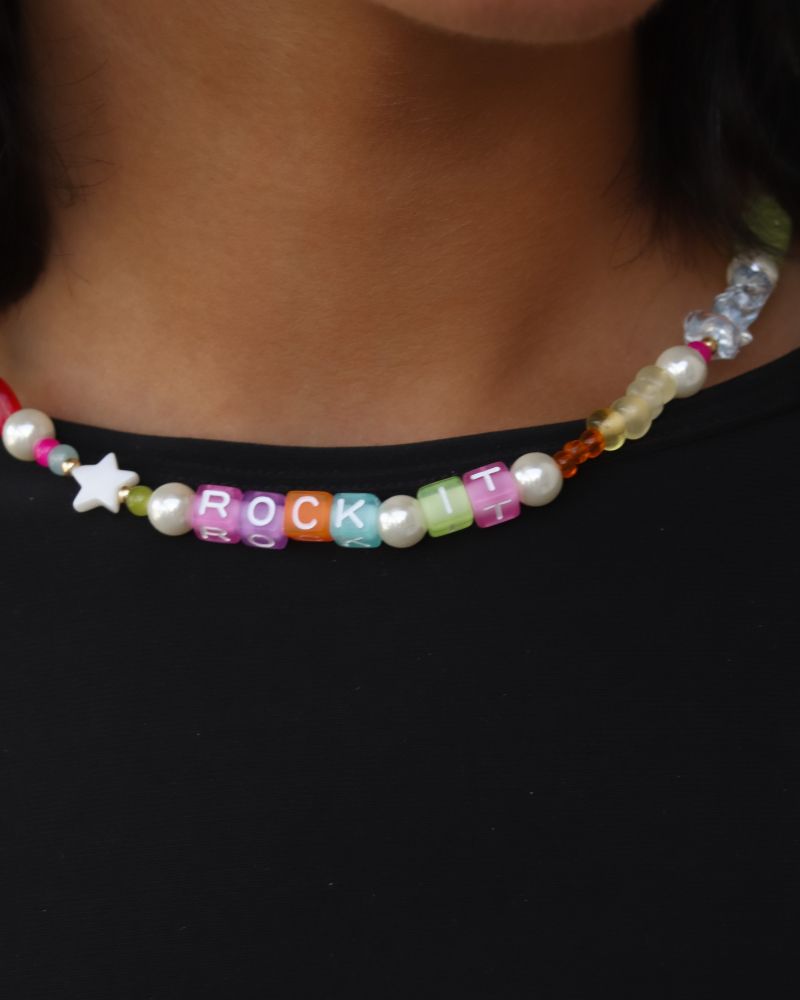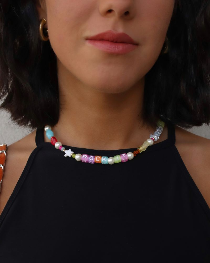Collar lleno de mostacillas de todos los tamaños y colores mezclado con perlitas de vidrio, cristales y piedras entremedio, increíble para darle ese toque de color a tu outfit, terminado en extensión de cadena y broche baño de oro.