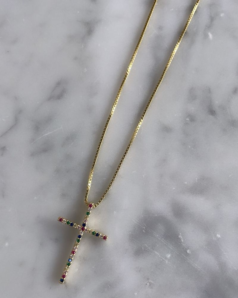 Cadena muy sutil con cruz x pequeños circones de colores ideal para darle un toque veraniego a un outfit Básico, pero también increíble para un look más formal.