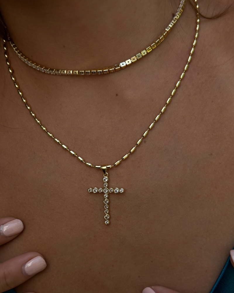 Cadena con forma de arroz muy sutil con Cruz imponente con detalles de circones ideal para darle un toque a un outfit Básico, pero también increíble para un look más formal.