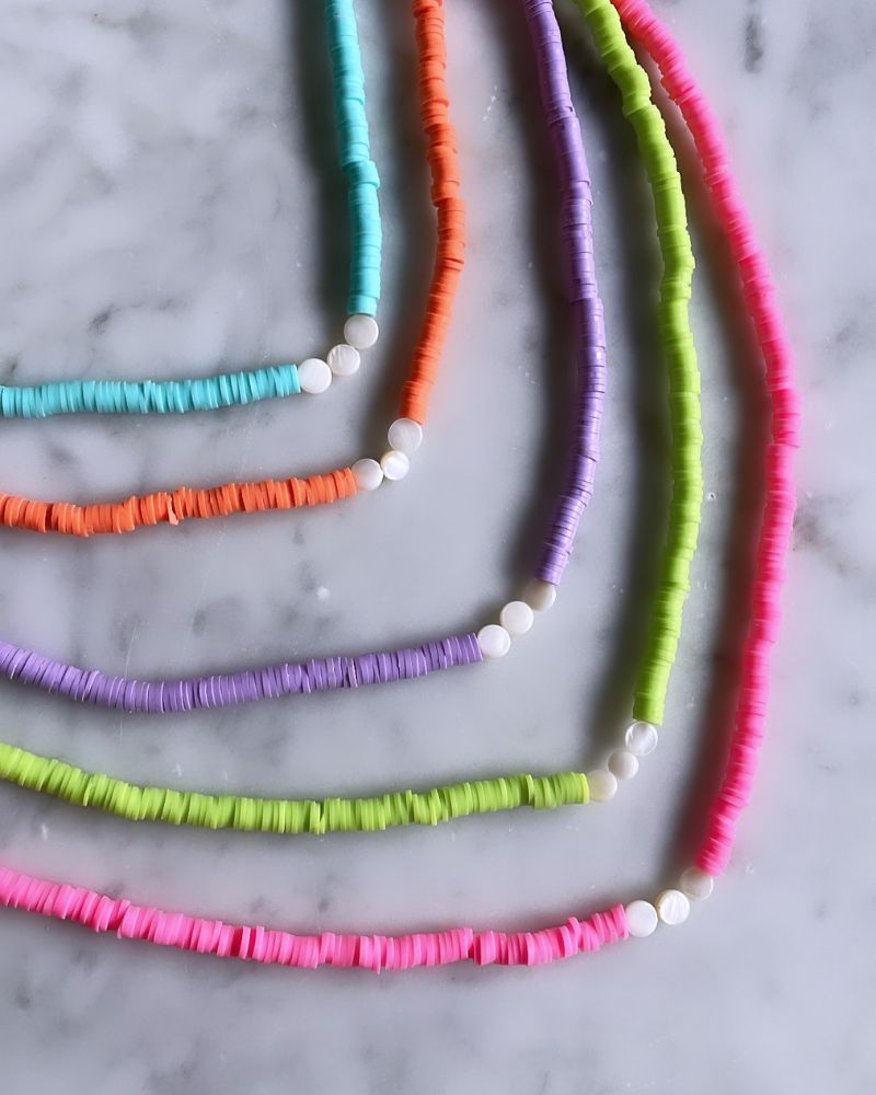 Collar de fimos con piedras Nacar en el centro, 5 colores disponibles inspirados en los colores del verano, ideales para combinar más de uno y darle un toque veraniego de color a tu outfit.