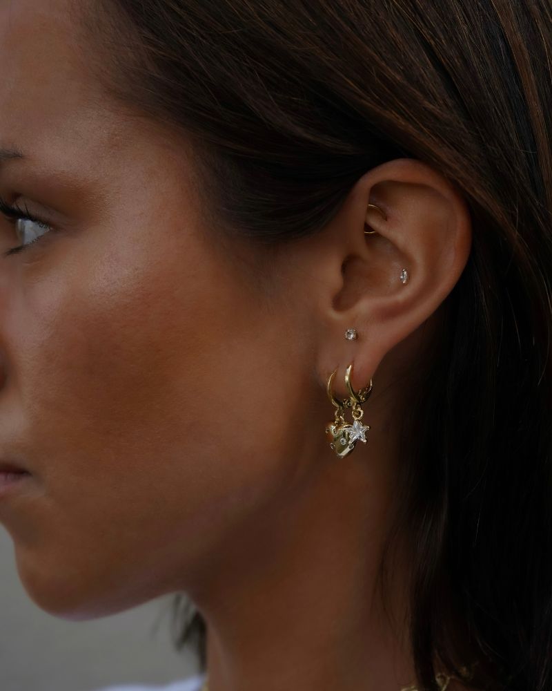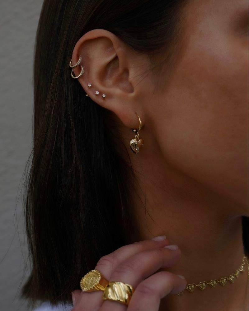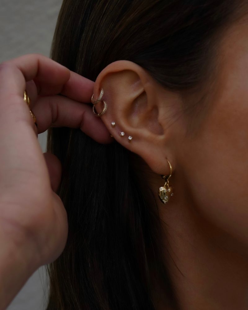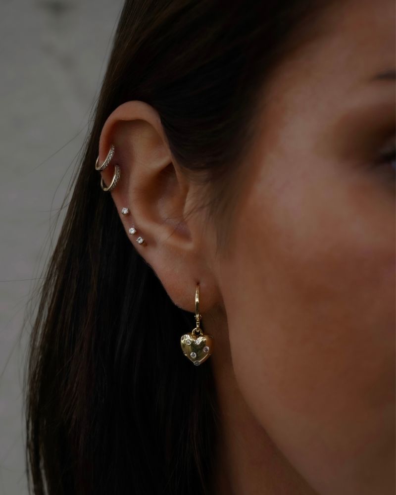 Aros en forma de Argolla con mini Corazón colgante con detalles de circones, tamaño ideal para arito principal o segunda perforación combinada con otros aros.