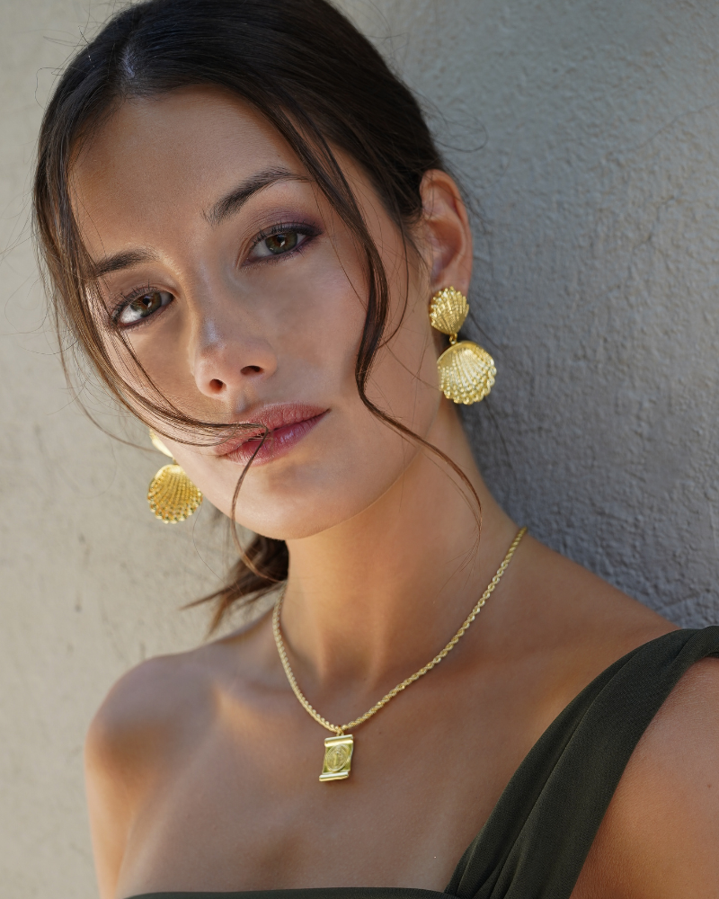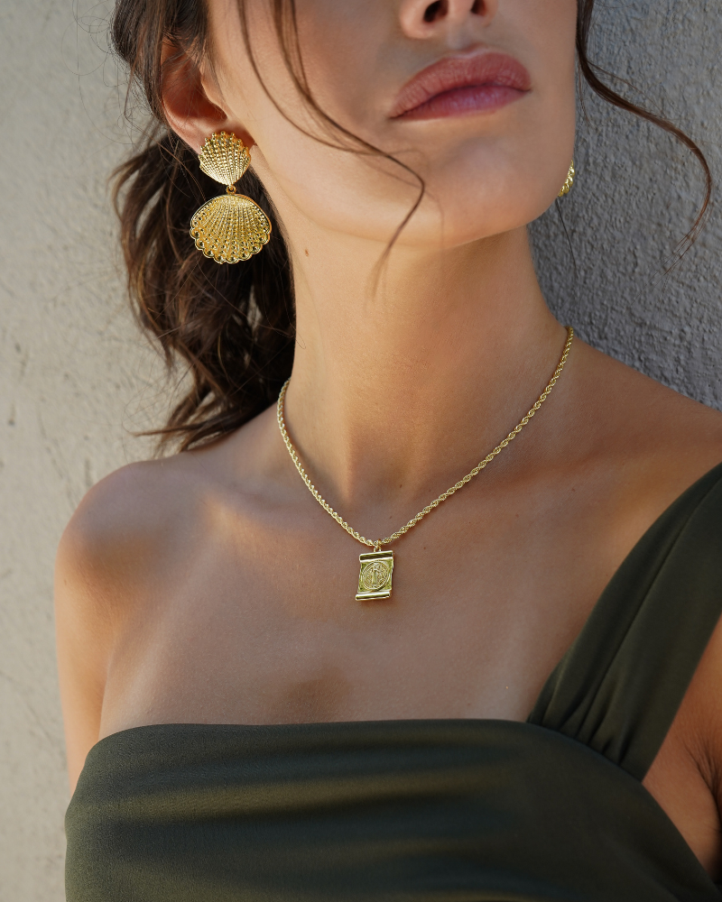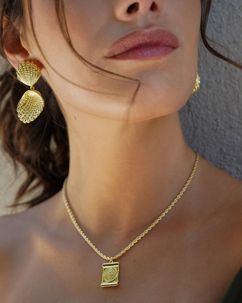 > Metal Base Bronce, enchape en oro 18k, con barniz protector y libre de níquel.