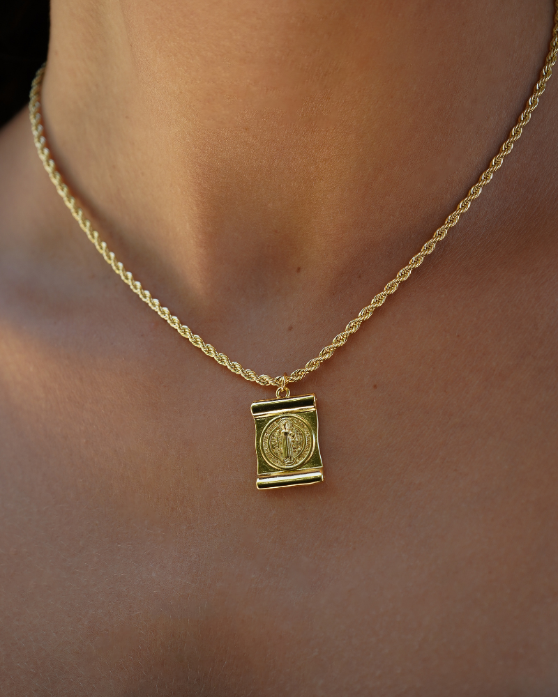 Cadena gruesa com Medallón con San Benito cuadrado, ideal para darle un toque a un outfit básico, pero también increíble para un look más formal.
