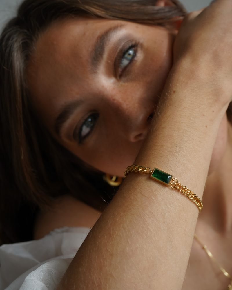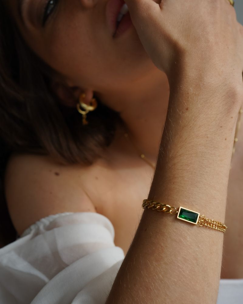 Pulsera de juego de cadenas muy versátil con piedra verde en el centro, ideal para darle un toque a un outfit Básico pero también increíble para un look formal, tenemos el collar en juego.